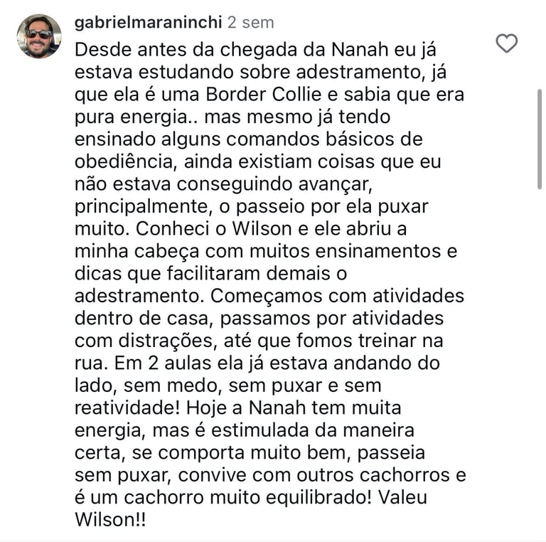Me chamo Wilson Domingues, sou adestrador e especialista em comportamento canino com mais de 12 anos de experiência ajudando cães e tutores a viverem melhor juntos.